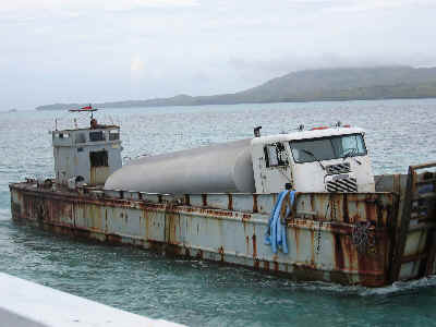 桟橋を歩いていると、船でタンクローリーが運ばれてきていた